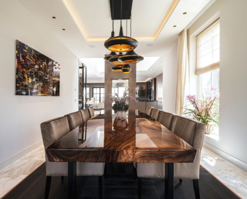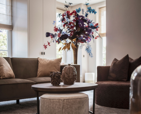 Dit karaktervolle huis heeft een verfrissende update gekregen waarbij de bestaande elementen op een eigentijdse manier zijn hersteld en aangevuld. De ruimtes zijn vernieuwd met warme materialen, verfijnde details en een natuurlijke balans tussen oud en nieuw. In de living en eetkamer creëren luxe texturen, comfortabele meubels en een harmonieuze indeling een sfeervol geheel. Ook de slaapvertrekken en badkamers hebben een tijdloze en elegante uitstraling gekregen, waardoor het landhuis nu een stijlvolle en comfortabele leefomgeving biedt die de oorspronkelijke charme van het huis versterkt.